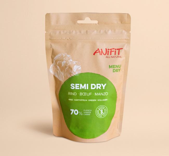 ANiFiT propose deux types d'aliments semi-humides pour chiens: Semi Dry poulet et Semi Dry bœuf. Il s'agit d'aliments complets de haute qualité, composés à 100 % de poulet ou de bœuf suisse frais, produits en Suisse. Ces deux aliments semi-humides sont préparés avec soin et conviennent aux chiens de toutes races et de toutes tailles. Grâce à leurs ingrédients et à leur traitement de qualité supérieure, ce sont des aliments complets parfaitement tolérés et très bien acceptés.