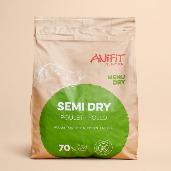 ANiFiT propose deux types d'aliments semi-humides pour chiens: Semi Dry poulet et Semi Dry bœuf. Il s'agit d'aliments complets de haute qualité, composés à 100 % de poulet ou de bœuf suisse frais, produits en Suisse. Ces deux aliments semi-humides sont préparés avec soin et conviennent aux chiens de toutes races et de toutes tailles. Grâce à leurs ingrédients et à leur traitement de qualité supérieure, ce sont des aliments complets parfaitement tolérés et très bien acceptés.