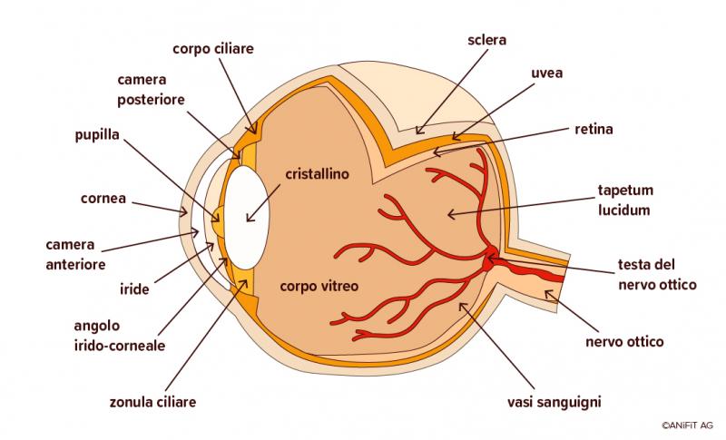 Una particolarità sorprendente sono gli occhi «scintillanti» di cani e gatti. Ciò è dovuto al «tapetum lucidum» (dal latino, tappeto luminoso): si tratta di uno strato riflettente situato dietro la retina. Quando la luce colpisce questo strato, viene riflessa e passa attraverso la retina una seconda volta. La luce è per così dire «raddoppiata» e permette all'animale di vedere anche al crepuscolo e in condizioni di scarsa luminosità.